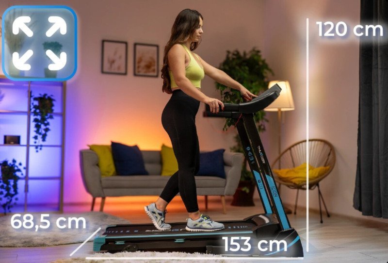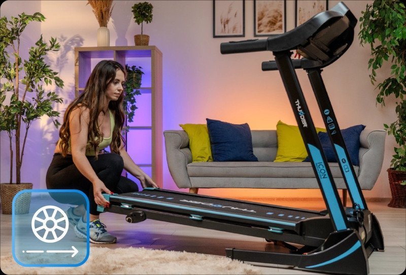 THUNDER®️ ICON-BLUE е моќна и неверојатно компактна трака за трчање, која лесно ќе се прилагоди во секој простор во вашиот дом, овозможувајќи ви активен фитнес без разлика на временските услови. Стабилна, удобна и тивка, опремена со сите модерни функции кои ви се потребни.